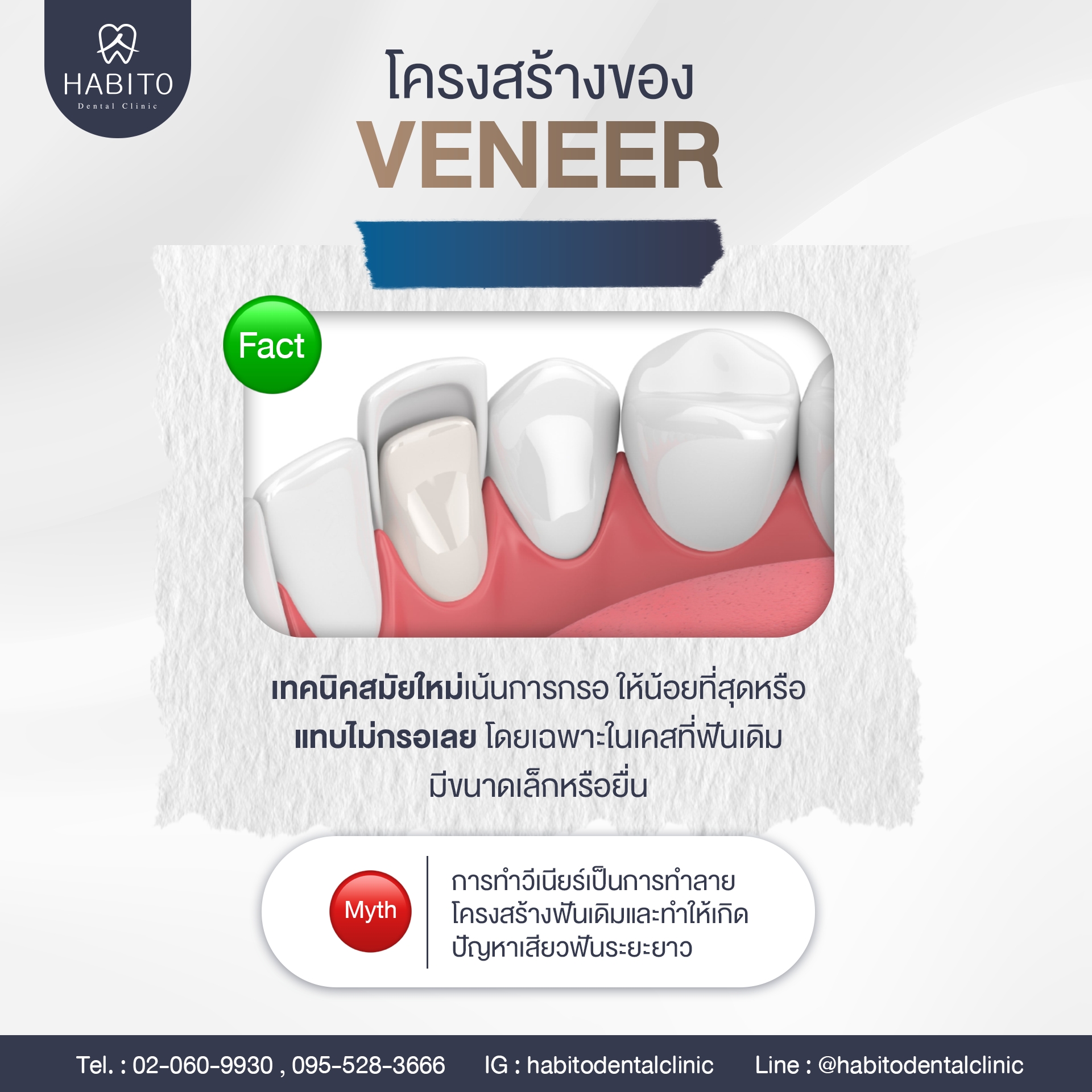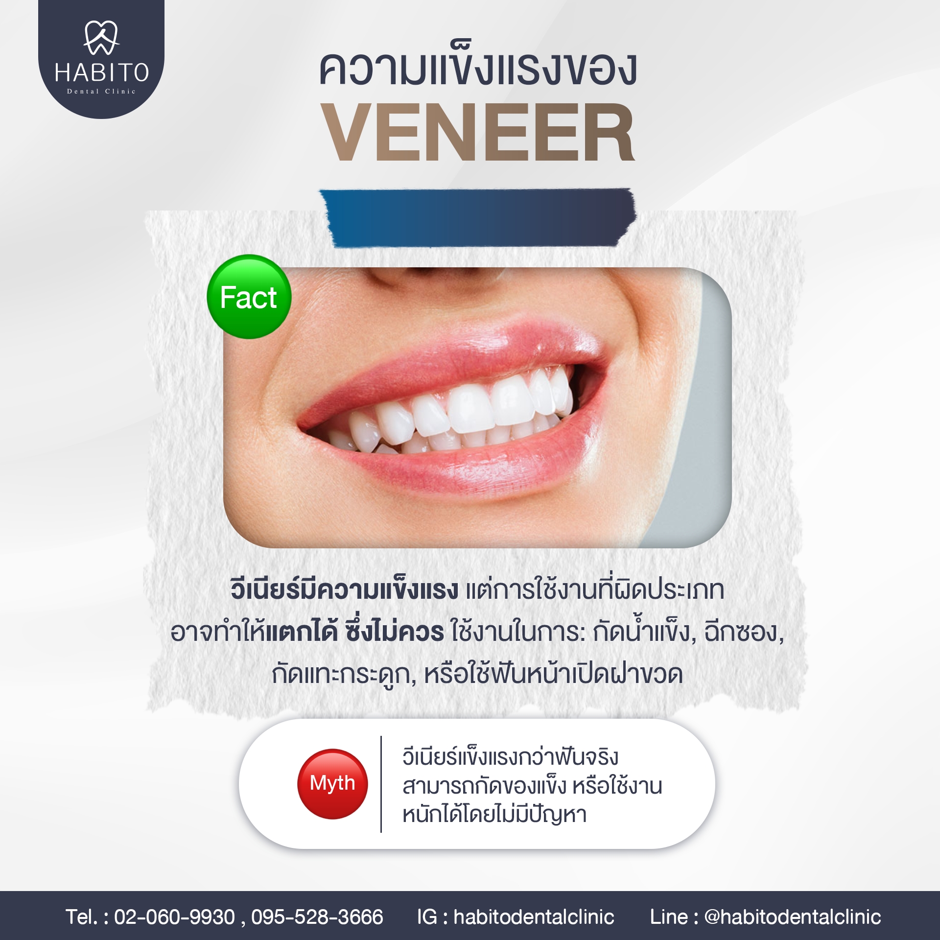 Fact: วีเนียร์มีความแข็งแรงแต่การใช้งานที่ผิดประเภท อาจทำให้แตกได้ ซึ่งไม่ควร ใช้งานในการ กัดน้ำแข็ง ฉีกซอง กัดแทะกระดูก หรือใช้ฟันหน้าเปิดฝาขวด